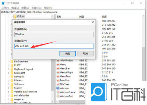 双击“Window”键值,将默认值“255 255 255”修改为“202 234 206”。